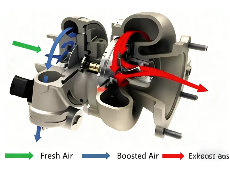 Turbocompresoarele folosesc gaze de eșapament pentru a învârti turbina.